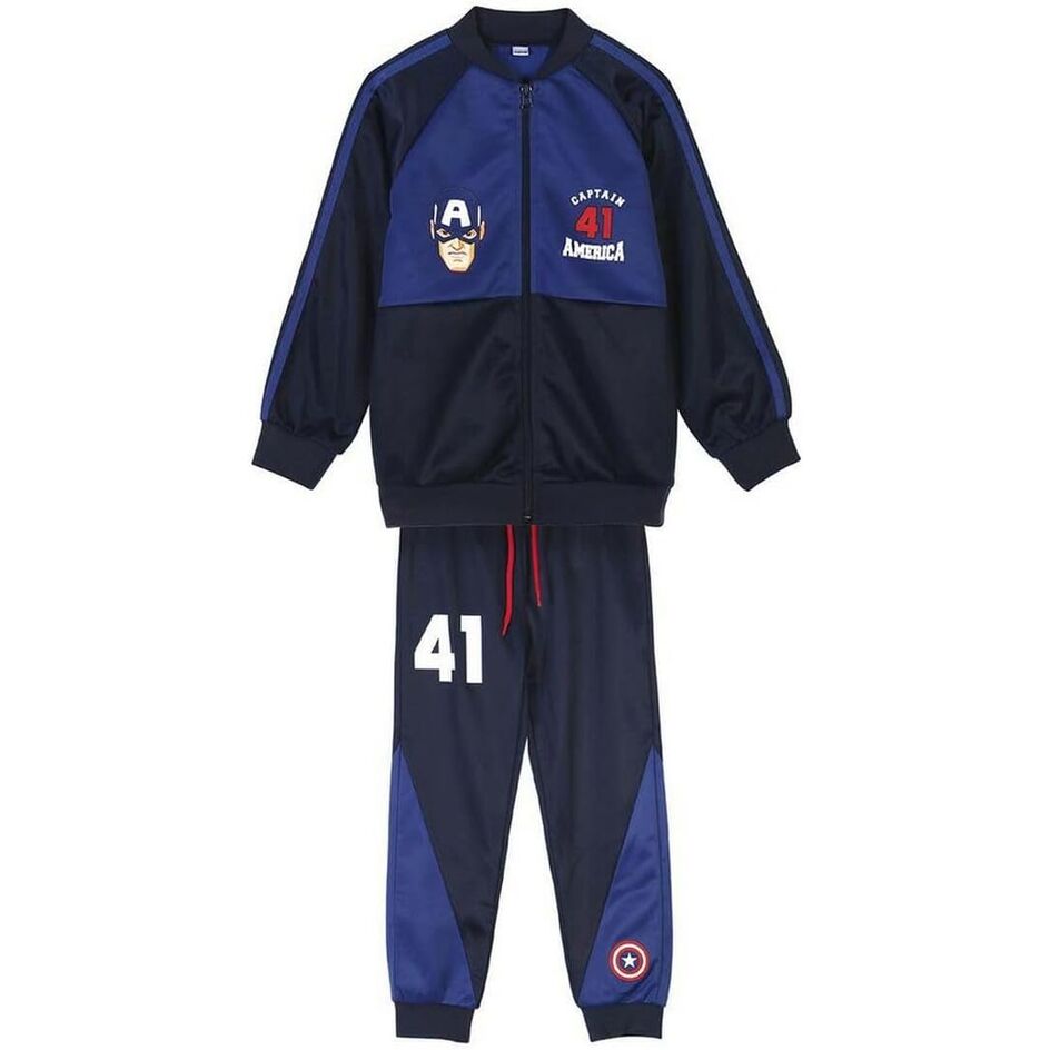 Diseño bicolor que combina dos tipos de azul marino y el estampado del capitan America. Combina pantalón con epuños elásticos y sudadera de cremallera sin capucha.